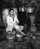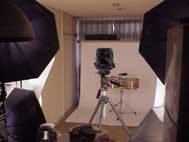 まずはティンパレスと一緒のウイリーさんのポートレートからスタート。次にコンガと一緒のポートレート。その後、ティンパレス、コンガ、ボンゴ、マラカスなどレコーディングで使ったパーカッションをいっぱい並べたポートレートを撮影。撮影の度に、使った楽器を廊下に出し、次の楽器を廊下から入れるという作業。楽器の出し入れの時にはドア付近にセッティングしたストロボをちょっと片付けてという作業もあって。。。時間がかかります。後半は4X5を使って撮影。楽器、ストロボ、4X5のカメラで狭い部屋はいっぱいに。異様な空間でした(笑)。 |