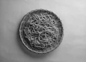 ←↑ライティングはバンクを付けたストロボ1灯。切り抜き用に白バックで撮影。ざる蕎麦やア−リオオーリオのようなシンプルなパスタは、個人的には難しい被写体だと思う。光りを回し過ぎると平べったくなるので。シンプルに1灯のみ。反対側にレフを置いてかるく起こしたのと、レフ無しの2パターンを撮影。左のテストポラはレフなし。 | |