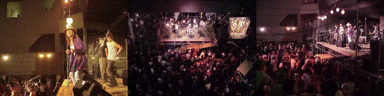 ↑写真左、めおと楽団ジギジギwithモッコリー舞踊商会。真ん中、カオルコさんのピアニカでこ弾き。今日は新曲を披露。右は、めおと楽団ジギジギwithサックス藤井康一。