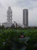 →写真展の帰りは不忍池を通って湯島へ。池が蓮で埋め尽くされておりました。赤いのは蓮の花? 私にはチビ太のおでんを連想させるホテルの右横に、いつのまにか高層マンションが完成しておりました。また今度4x5を担いで撮りに来ようかな〜。 |