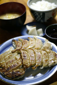 | ←昨日の晩ご飯。お昼に豚肉のスタミナ焼き定食(味噌味、うます!)を食べに行ったラーメン屋さんでテイクアウト。餃子3人前で450円は安い♪一応、ご飯は炊いて、味噌汁も作りますた(笑)。 | ||