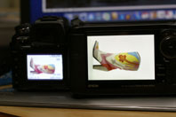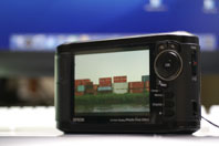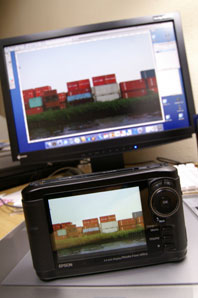 →ナナオのディスプレイColorEdge CE240Wと、P-5000の画面を同じJPEGデータでチェック。液晶なので視野角によって多少色がかわります。両方を真正面から見比べれば、この写真程の色の差はありません。私的には、十分ロケ先で画像チェックの参考にできる表示だと思う。 | ![]() |