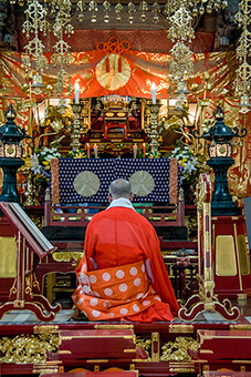 ↓本堂に安置された厨子。→厨子を前にして読経する住職。 |
