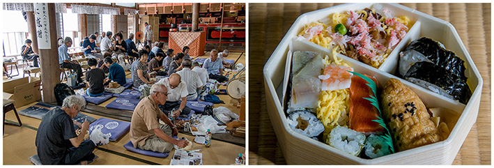 拝観所での絵解きが終了すると、本堂でお弁当とペットボトルのお茶が無料で配られた。 瑞泉寺や善徳寺の絵解きでは庫裏で600円ほどのお斎を出される。思いがけず無料のお弁当が出され、ありがたくごちそうになった。 お弁当を食べて扇風機の風に当たって休んでいると、太鼓の乾いた音と鐘の音。13時からの風入れ大法要の5分前を知らせる合図だった。 |