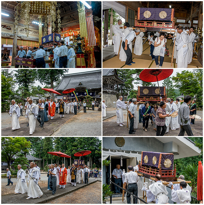 ↑本法寺の風入法要。重要文化財の曼荼羅絵図を納めた厨子を国宝殿から出し本堂に移す途中、信徒が無病息災を祈って厨子の下を潜る。↓上村木の七夕祭り。12体のアジロと呼ばれる神の化身が屋形船のお神輿と共に町内を練り歩く。 |