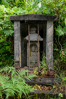 | 有峰口から常願寺川に掛かる橋を渡って、芦峅寺集落の方へ歩く。あまり見たことのない花が咲いていたので撮影し、後で名前を聞いたら葛の花だった。 坂道を上がった小学校の横、村の入口に青面金剛を祀った庚申塚がある。立山信仰が盛んだった頃、村人や登拝者に禍を与える悪霊の進入を防ぎ、無病息災や長寿を願って建立された。 芦峅寺のオショウライでは村の中心にある雄山神社より千垣駅寄りに住む人は庚申塚へ、雄山神社よりも立山寄りに住む人は布橋の先にある墓地へ松明を持って祖先の霊を迎えに行く。集落にあるあの世と繋がる2つの場所へ、それぞれ向かうわけだ。 庚申塚の石段を上ると砂利を敷いた小さなスペースがあり、そこに松明(オショウライ棒)を燃やす窪みが作られ、傍に消火器が置かれていた。 |