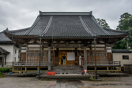 ↑駅から善入寺までのスナップ。 ←善入寺。 途中にあるカーテンを閉じたりシャッターを下ろして眠ったようなお店を撮影しながら、小雨の降る中25分ほど歩いてお寺に着いた。 お堂では、地謡の男性が準備をされていた。やはり今日は雨が降ってきたので、本堂の中で踊りを行うそうだ。男性たちはこれから近くの公民館へ着替えに行くので、始まりまで中でお待ち下さいと言われる。 |