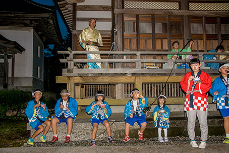 準備が整い踊りが始まったのは18時25分頃だろうか。地謡は唄・囃子が3人、三味線3人、胡弓1人、太鼓1人の計8人。踊り手は子供が14人に、大人の女性6人、男性1人。 続けて10分ほど踊ると休憩になり、演者と観客に飲み物が配られた。 休憩の後、同じ踊りをもう一度踊るのだが、ポツポツ降り出した雨が本降りになり、今度は急遽お堂の中でやることになった。 |